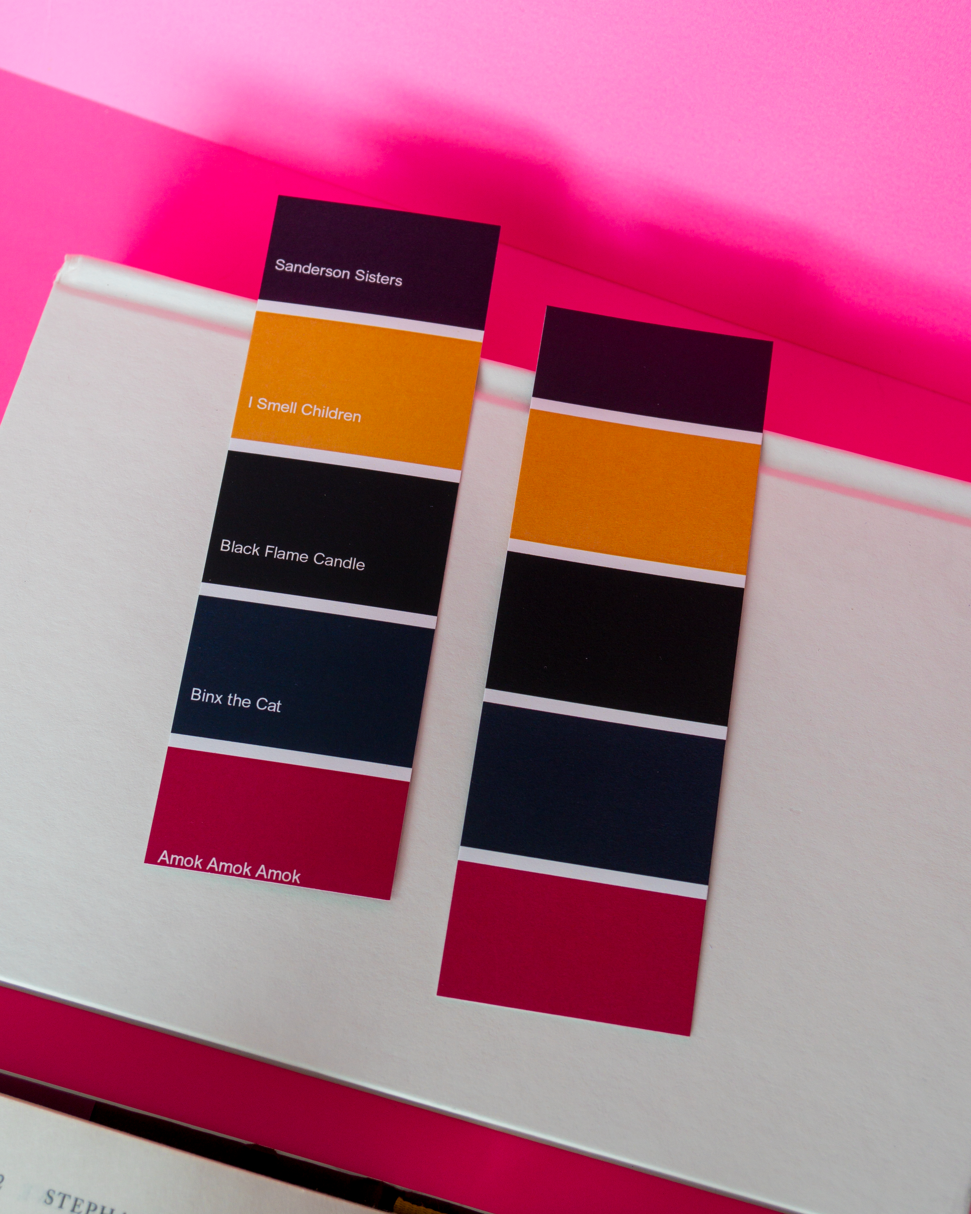 Add a touch of spooky fun to your reading routine with this bookmark, featuring paint chip–style swatches inspired by Hocus Pocus: Sanderson Sisters, I Smell Children, Black Flame Candle, Binx the Cat, and Amuck Amuck Amuck. Perfect for fans of the classic Halloween cult favorite. 🕯️🐈⬛✨